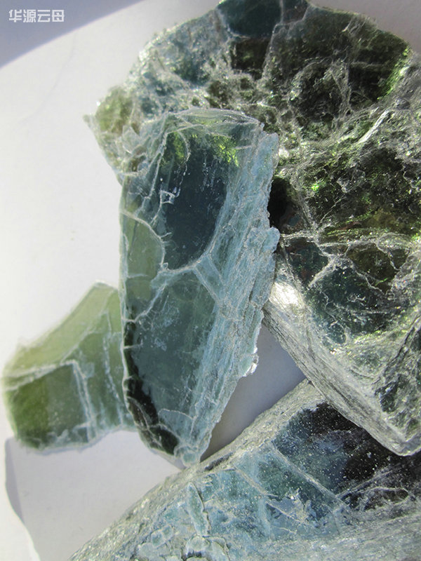 云母具有完善的解理,可以剝分。理論上白云母能剝分成10左右,。云母晶體的隱伏解理,即為打象和壓象。白云母薄片一般無(wú)色透明,但往往染有綠、棕、黃和粉紅等色調(diào);玻璃光澤,解理面呈珍珠光澤。